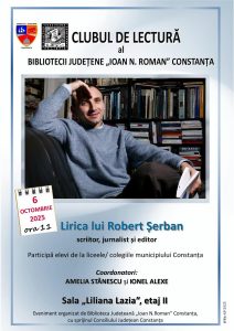 Luni, 6 octombrie 2025, de la ora 11:00, la Sala de lectură „Liliana Lazia”, etajul II, vă invităm la o nouă ediție a „Clubului de lectură” organizat de Biblioteca Județeană „Ioan N. Roman” Constanța, dedicată liricii poetului, jurnalistului și editorului Robert Șerban.