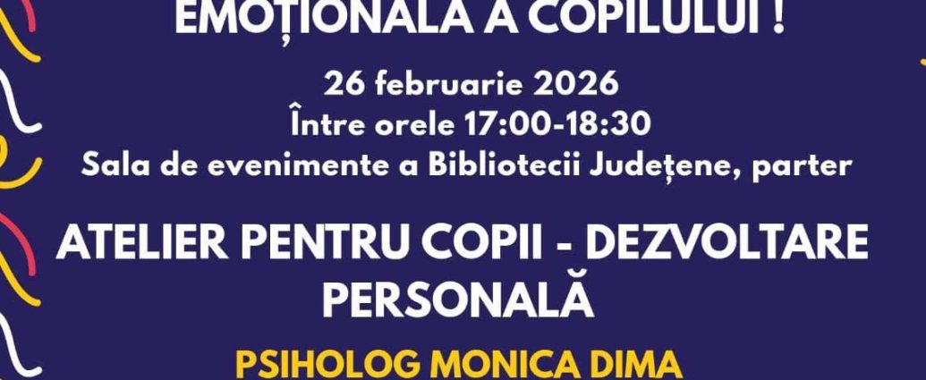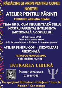 Biblioteca Județeană „Ioan N. Roman” Constanța invită părinții la atelierul Nr 5 dedicat familiei și dezvoltării emoționale a copiilor, cu tema „Impactul stilului parental asupra inteligenței emoționale a copilului”, care va avea loc în data de 26 februarie, la Sala de Evenimente (parter).